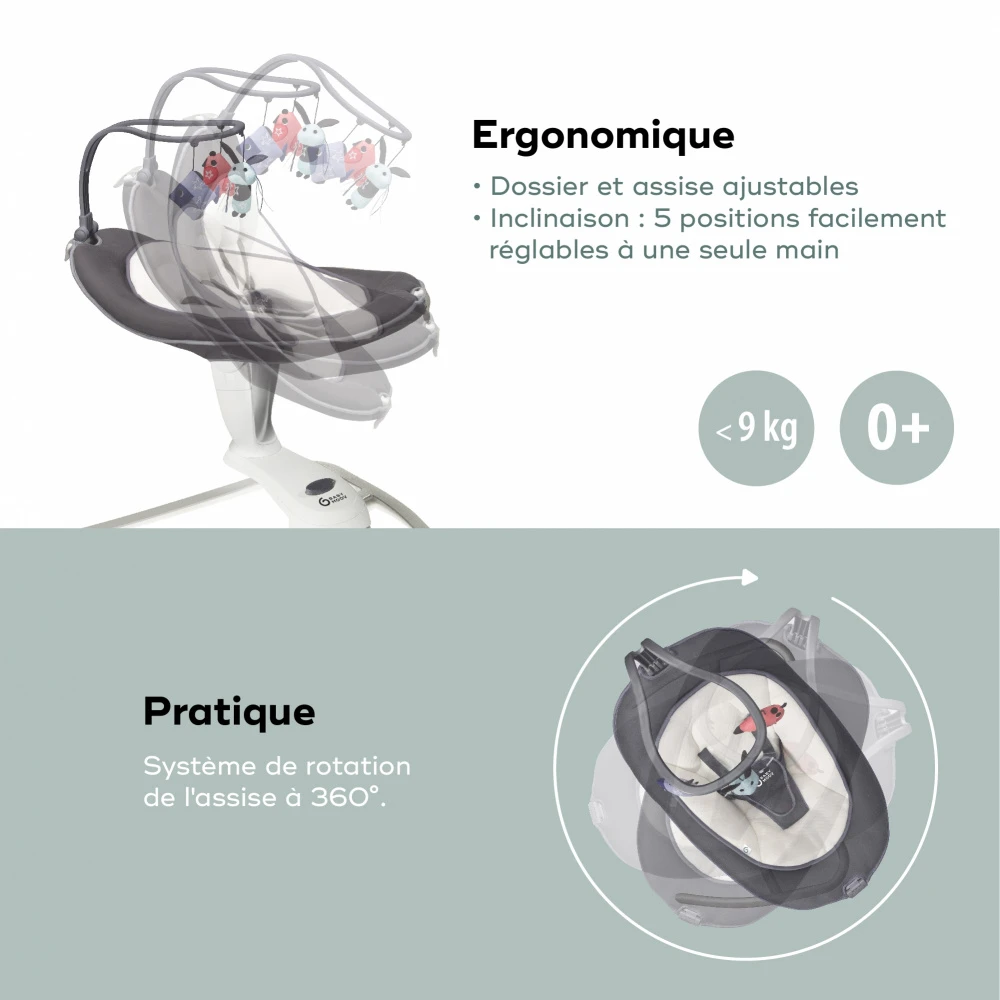 La balancelle bébé swoon de Babymoov s’utilise de la naissance de l’enfant jusqu’à ses 9 kg. Cette balancelle de Babymoov est une conception pour allier apaisement et divertissement pour votre bébé. En effet, la balancelle swoon motion de Babymoov possède plusieurs fonctionnalités pour détendre bébé mais aussi l’amuser !