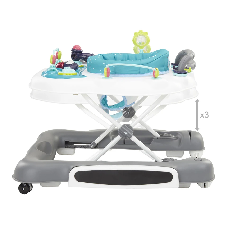- 5 en 1 : Trotteur (jusqu’à 12 kg), Pousseur, Balancelle, Assise 360° et Aire de jeux,