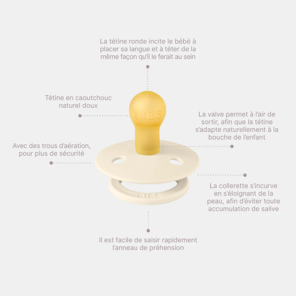 Optez pour le Pack de 2 sucettes colour caoutchouc 0-6 mois vanilla et peach de chez Bibs. Utilisable dès la naissance, elles seront idéales pour rassurer et réconforter bébé. La tétine ronde de cette sucette en caoutchouc incitera bébé à placer sa langue et à téter de la même façon qu’il le ferait au sein. La valve permettra à l’air de sortir pour que la tétine s’adapte naturellement à la bouche de bébé. La collerette s’incurve en s’éloignant de la beau de bébé pour éviter l’accumulation de salive. Pratique, ces sucettes Bibs sont compatibles avec les attaches sucettes Bibs.