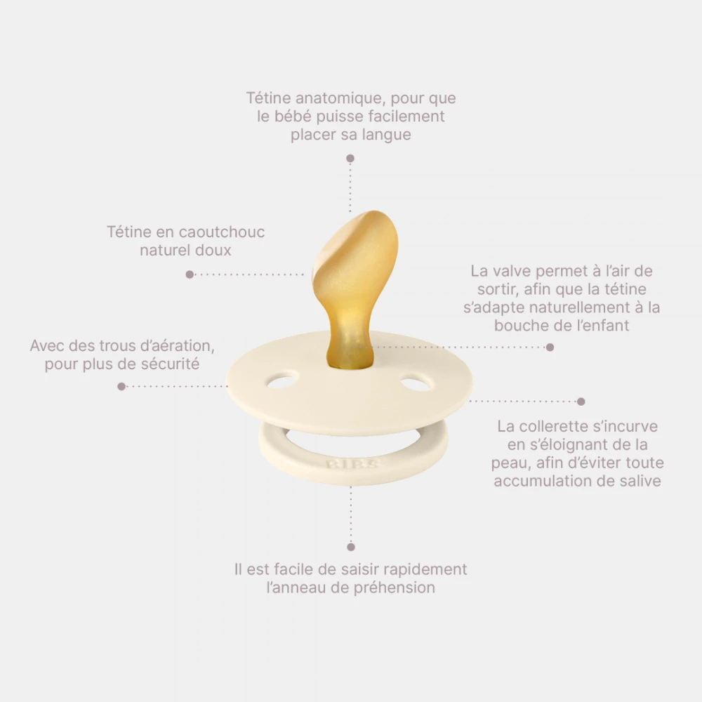 Optez pour le Pack de 2 sucettes colour caoutchouc anatomique phosphorescente 0-6 mois sage et cloud de chez Bibs. Utilisable dès la naissance, elles seront idéales pour rassurer et réconforter bébé. La tétine anatomique en caoutchouc a un embout courbé. Cela incitera bébé à placer sa langue et à téter de la même façon qu’il le ferait au sein. L’embout courbé fait que votre enfant n’aura pas besoin de téter aussi fort qu’avec une tétine ronde pour qu’elle s’aplatisse complètement sa bouche. La valve permettra à l’air de sortir pour que la tétine s’adapte naturellement à la bouche de bébé. La collerette s’incurve en s’éloignant de la beau de bébé pour éviter l’accumulation de salive. Pratique, ces sucettes Bibs sont compatibles avec les attaches sucettes Bibs.