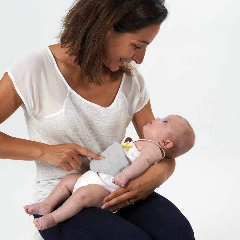 ajustable grâce à ses bandes auto-agrippantes, la mini-bouillotte reste bien en place sur le ventre des nourrissons.