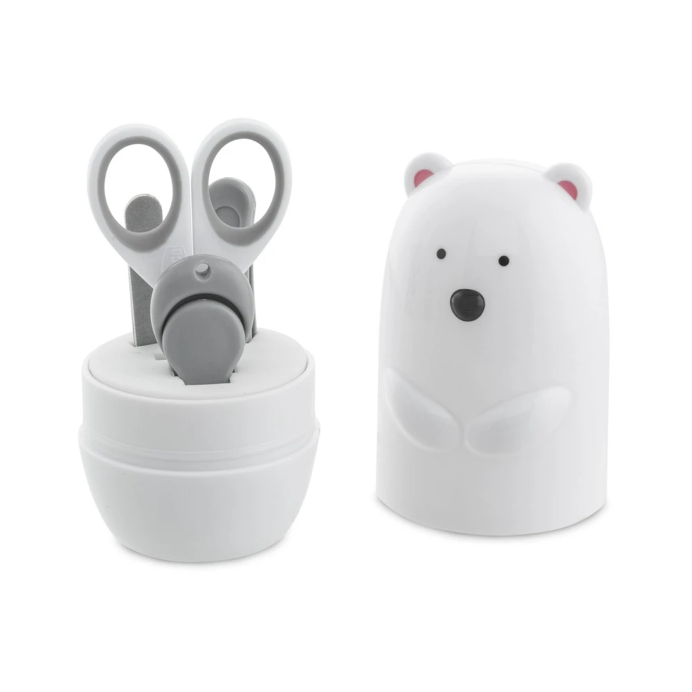 Optez pour le Set manucure bébé ours polaire de chez Chicco. Le kit de manucure pour bébé comprend une paire de ciseaux à bouts ronds, 2 limes à ongles en carton émerisé convenant aux nouveau-nés, un coupe-ongles pour bébé et une pince à épiler. Le tout rangé dans une petite boîte en forme d’ours polaire.