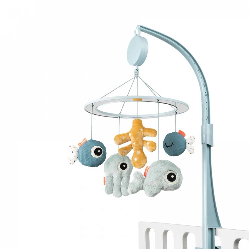 Le Mobile musical miroir sea friends bleu de chez Done by Deer. Laissez votre bébé profiter de la berceuse réconfortante et amusez-vous à découvrir les reflets dans le miroir qui flotte au-dessus des amis endormis. Avec ses douces nuances ,le joli mobile suscitera la curiosité de votre bébé. Croco, Elphee, Raffi et Nozo stimuleront doucement les sens de bébé et favoriseront le développement précoce avec des points et des rayures contrastants. Le bras de support inclus peut facilement être monté sur les barres de lits, de lits de bébé ou de parcs pour enfants.