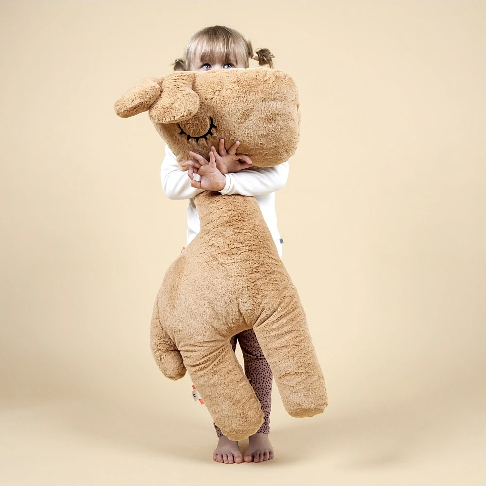 Le gros animal en peluche est doux et velu. La couleur chaude moutarde est parfaite pour cette douce amie.