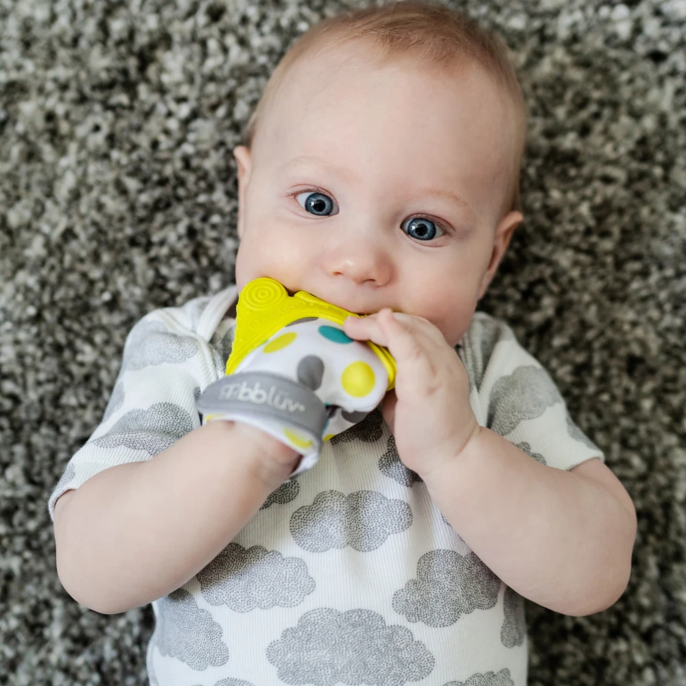 Le gant de dentition en silicone souple de chez Bblüv. Utilisable dès la naissance, il est l’accessoire idéal pour soulager les poussées dentaires de votre enfant. En silicone souple de qualité alimentaire et doté de différentes textures, le gant l’aidera sur le travail d’auto-succion. Le plus de cet anneau est sa forme : Plus hygiénique que des jouets de dentition ordinaires, votre enfant pourra mettre le gant à la main ce qui évitera à ce dernier de tomber au sol. Ainsi le gant de dentition Glüv amusera votre enfant tout en soulageant ses gencives sensibles lors des poussées dentaires.
