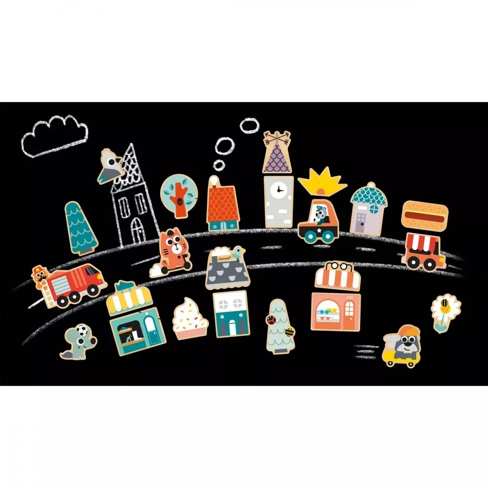 Optez pour le Lot de 24 magnets ville de la marque Janod. Ce coffret est composé de 24 magnets en bois qui disposent tous d’un aimant. Votre enfant pourra jouer avec et les poser à sa guise sur différentes surfaces comme un réfrigérateur.