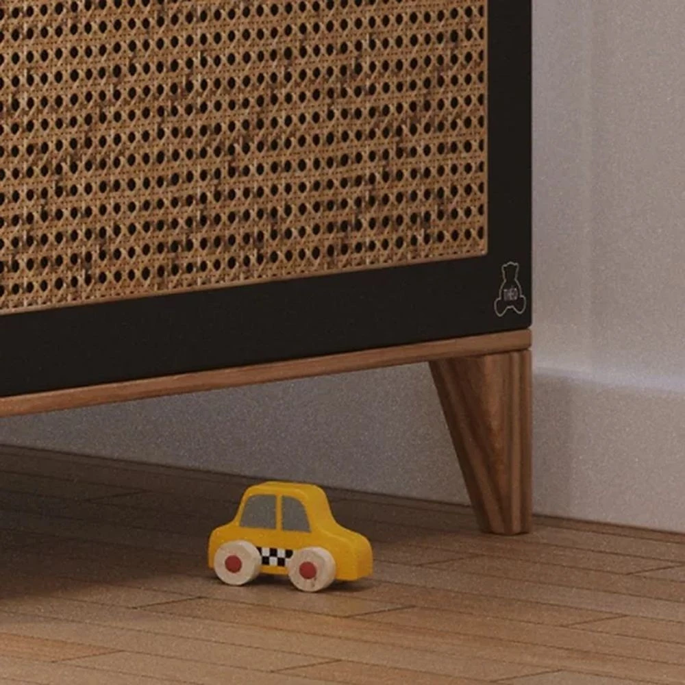 Le lit évolutif Nami Onyx en tressage de rotin 70×140 cm de la marque Théo. La marque Théo a fait le choix de privilégier le respect de la santé et de l’environnement : des finitions à base d’eau, sans odeur, sans solvants et sans émanation; des emballages sans plastique et dans le respect des normes françaises, européennes certifié par un laboratoire français indépendant. Fabriqué en rotin naturel, le lit vous assurera solidité et durabilité. Évolutif, le lit accompagnera votre enfant durant sa croissance. Plus il grandit, retirez lui un des deux côtés avec les barrières, puis les deux lorsqu’il est suffisamment grand et rajoutez-lui à la place le kit évolutif. Ainsi votre berceau sera transformé en véritable lit de grand ! Avec la commode assortie, votre enfant sera plongé dans un univers tendance et épuré.