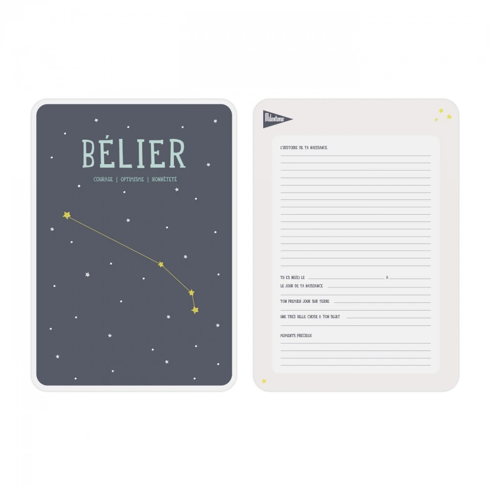 Affiche poster astrologique bélier de la marque Milestone. C’est l’accessoire parfait pour personnaliser et décorer la chambre de votre bébé. Au dos de l’affiche, vous pourrez écrire au feutre pour garder des souvenirs des premiers mois de votre enfant. L’affiche est livrée avec un crochet pour l’accrocher au mur. Sur l’affiche, il y a la constellation du signe astrologique ainsi que 3 mots pour décrire les valeurs du signe.