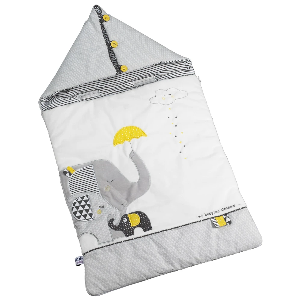 Pour accompagner bébé dans ses sorties, Sauthon a imaginé ce nid d’ange dans un univers coloré en blanc, gris et jaune. Un velours tout doux et des imprimés graphiques s’associent pour emmener bébé aux pays des éléphants.
