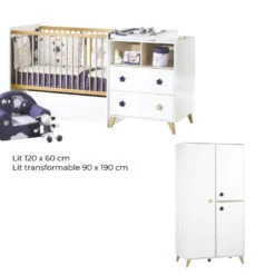 Chambre Trio Carrousel Lit 60×120 Cm + Commode à Langer + Armoire Blanc Et Hêtre