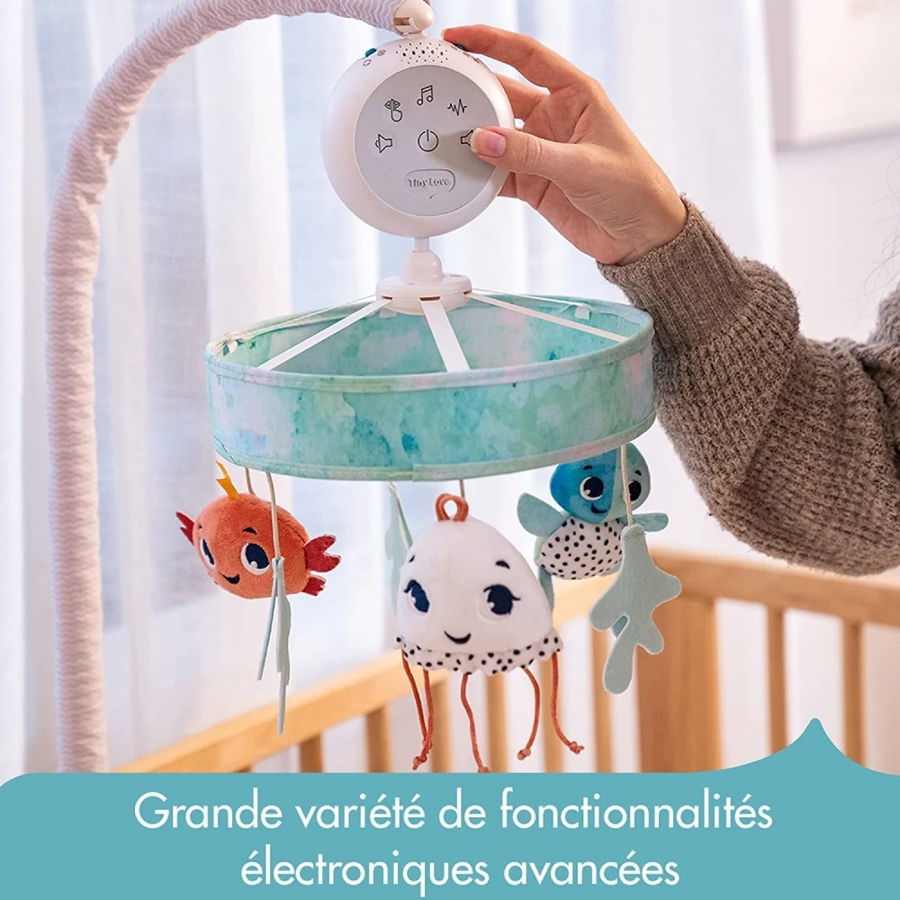 Mobile musical trésor de l’océan de la marque Tiny Love. Ce produit d’éveil 3 en 1 a été développé pour stimuler l’éveil de votre bébé. Le mobile peut aussi bien être musical, veilleur ou projecteur. Il projettera au plafond différentes formes qui apaiseront votre bébé. 9 mélodies d’une durée totale de 30min permettra d’apaiser bébé.