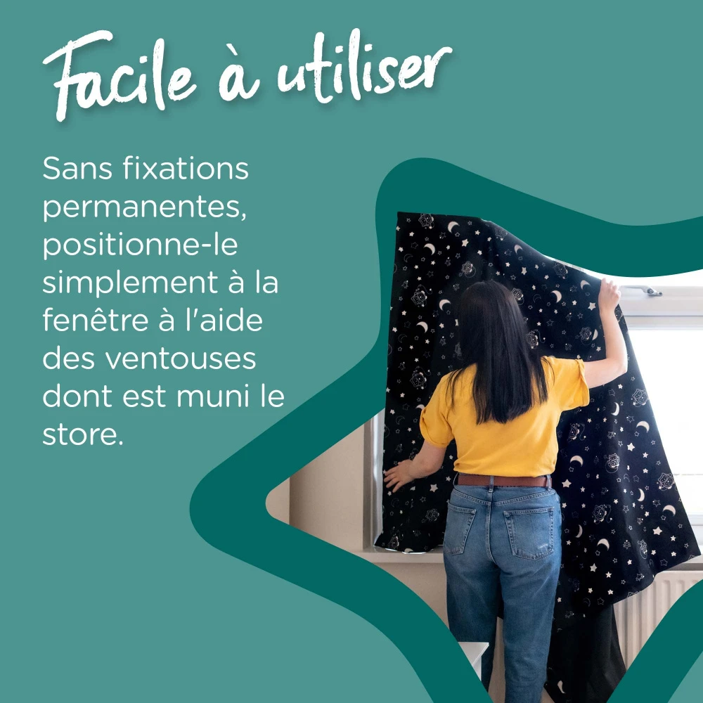 Ce store occultant portable permet de créer une obscurité totale à n’importe quel moment de la journée. Il se fixe directement sur la vitre à l’aide de petites ventouses. Il s’adapte à n’imorte quelle fenêtre jusqu’à une taille maximale de 130 x 200 cm.