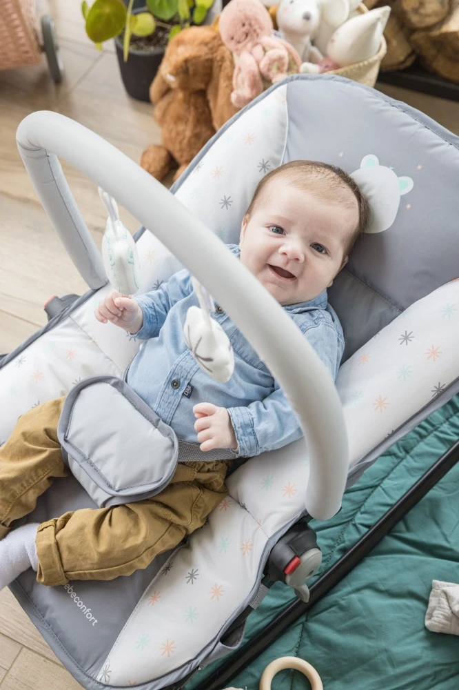 Le Transat bébé starlight – warm grey de chez Bebeconfort. ce transat confortable grâce un siège matelassé souple et molletnonnée. Il est composé d’une arche avec 2 jouets inclus. Il possède un système de réglage sur 5 positions.